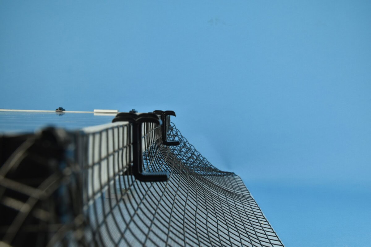 The Stainless steel clips that come with the mesh attach the mesh to the solar panels without piercing them, the system is designed to protect the integrity of solar panels. The solar panel bird deterrent mesh creates a physical barrier to keep birds from accessing and nesting in the area beneath the solar arrays.